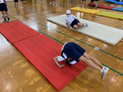 倒立前転、しんしつ後転など前転や後転の基本の技からレベルを上げて挑戦している姿がみられました。友達のいいところをまねする姿も見られ,お互いに教えあう様子もありました!