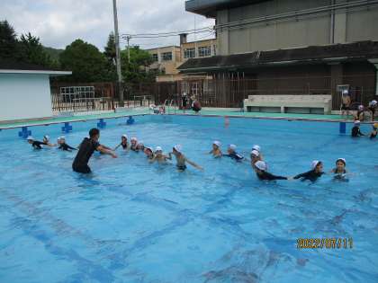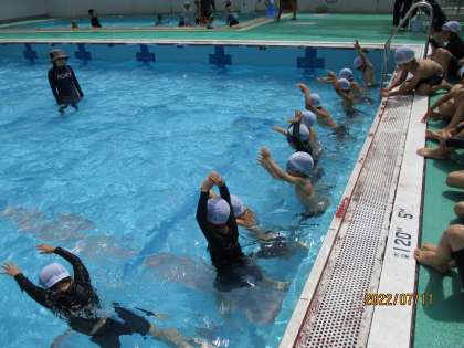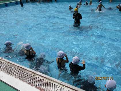 昨日の一年生の体育科では、お天気にも恵まれて、青空の中「水あそび」の授業をしました。それぞれが決めた目標に合わせて、泳いだり、浮かんだり、潜ったりを練習しました。