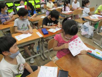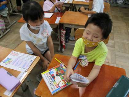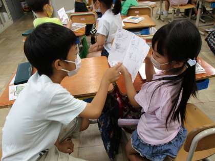 1年生の算数科では、「5−3=2」などの式を使って絵を描き、ペアの子に見せて、ペアの子は絵と式を見て、ストーリーを考えるという授業をしました。どの子も工夫をこらした面白いストーリーの絵本が出来上がっていました。