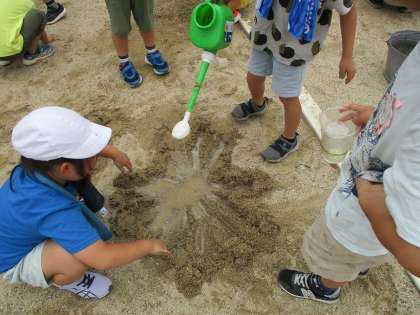 1年生の図画工作科では、運動場の砂場を使って、「すなやつちとなかよし」という授業をしました。水を使って固めながら大きな山を作ってトンネルを掘ってみたり、カップを使って色々な形をたくさん並べたりしていました。創造がどんどん膨らみ、体全体をつかって、楽しみながら色々な作品を作っていました。