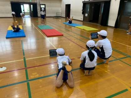 マット運動の学習が始まった時よりできる技が増やすことができました。友達のいいところやコツを聞いて練習したり、自分の少し苦手な技やあと少しでできそうな技に挑戦したりと積極的に取り組むことができました。