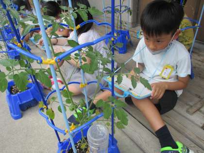 生活科「ぐんぐんそだておいしいやさい」では、ミニトマトの観察をしました。