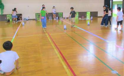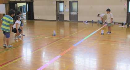 送風機で強い風や弱い風を送り,どのくらい車が進むか,体育館で実験しました。だいたい同じ長さでしたが,中には考えていた以上に遠くまで進む車もありました。どうやら,車輪がしっかりとめられているかどうかで,進む長さにもちがいがでてくるようですね。
