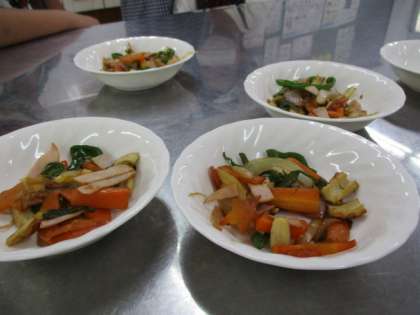 家庭科室にて「彩り炒め」を作りました。具材はニンジン・ピーマン・玉ねぎ,ハム,ちくわです。野菜を洗い,具材を切ったり炒めたり,星の子のみんなで力を合わせて頑張りました。包丁やピーラーは慎重に使い,安全に楽しく調理することができました。