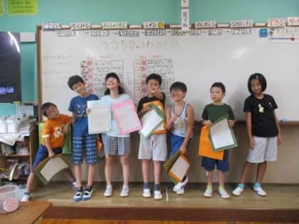 「カエルを捕まえるのがうまい」「いつも優しい」など、それぞれの良いところを沢山見つけてくれました。素敵な通知表をもって、記念撮影をしました。