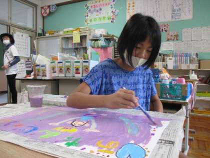 テーマである「夏休み」を描くにあたって、それぞれが夏休みの思い出を振り返りました。友達とプールで遊んだこと、お祭りにいったことなどを思い出して、思い思いに「夏休み」を描きました。