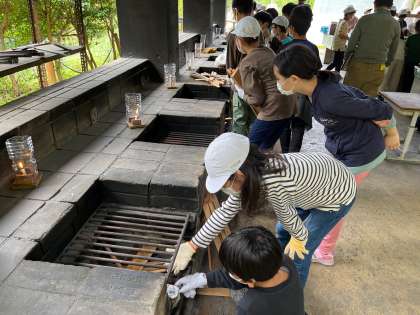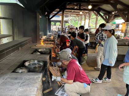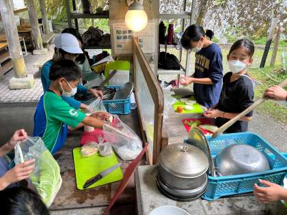 野外炊事です。豚汁をつくるために具材を切って火にかけます。なかなか薪に火がつかずに,炊事場には,祈りの声が響いていました。どんな豚汁になるのでしょう。