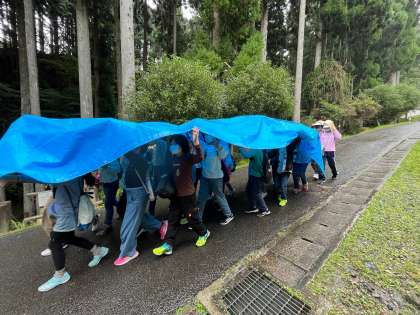 炊飯場に傘を持っていくのを忘れた人達は,急遽,届けてもらったブルーシートを傘代わりに移動しました。