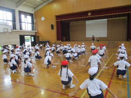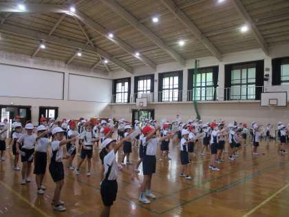 スポーツフェスタにむけて学年でおどりの練習をしました。新しく「美ら海シーサー」という曲のおどりも練習し始めました。ペットボトルをたたきながら,元気いっぱい踊っています!