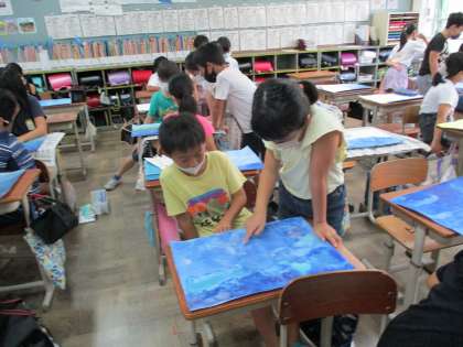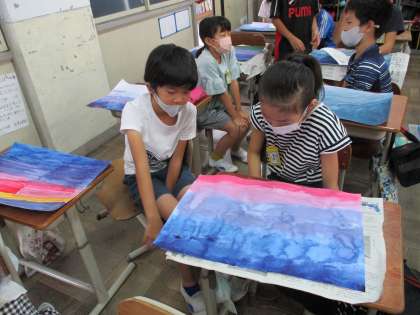 図画工作の時間に取り組んでいる絵を見てほめあいます。
