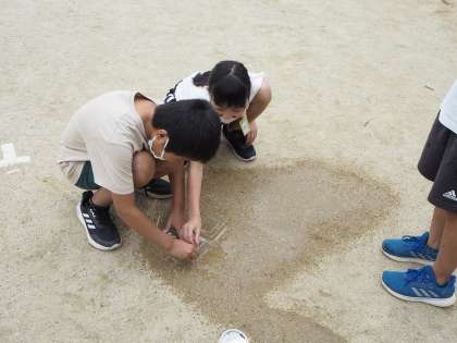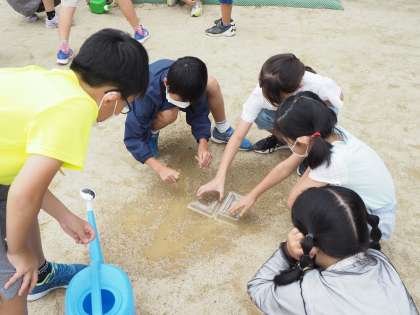 濡らした地面に透明の容器をかぶせ、場所によっても変化するのか調べていました。