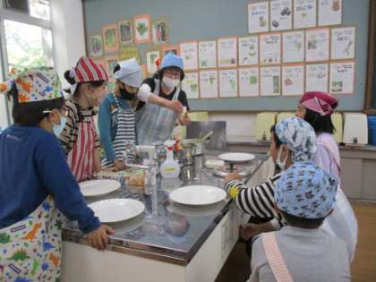 協力して焼き芋、みそ汁、スイートポテトを、完成させることができました。給食と一緒に美味しくいただきました。