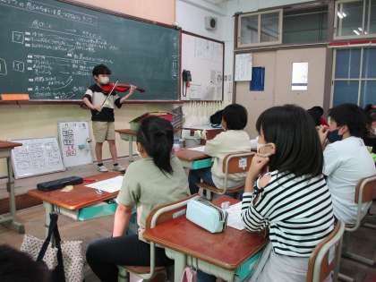 3年生の中にバイオリンを練習している子がいて、メヌエットを少し練習しているということで、3クラスでそれぞれ演奏してもらいました。いつもはスピーカー越しの音で鑑賞しているのですが、さすが生の音です。一音も聞き逃すまいという雰囲気になり、じっくりと鑑賞させてもらいました。バイオリンを始めてそれほどの期間ではないとのこと。今後の活躍が楽しみです。