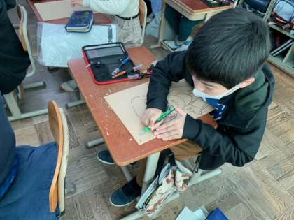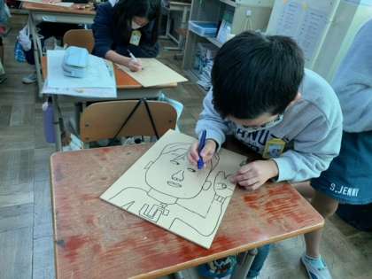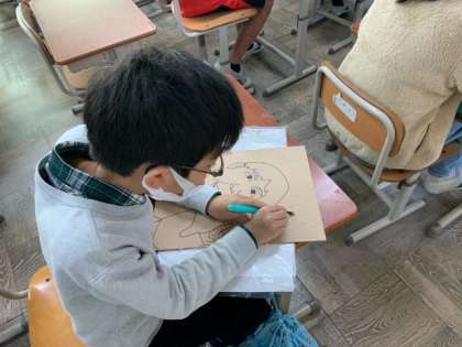 など、苦戦する姿が見られました。それでも彫る向きを変えたり、2つの彫刻刀を組み合わせたりと楽しく工夫して取り組んでいました!