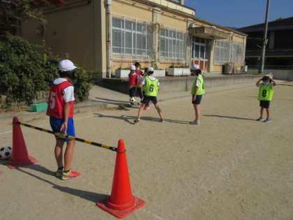 パス練習とミニゲームを行いました。パスはまだまだ力加減や蹴る方向が難しいようですが、シュートを決めようと真剣に頑張る子ども達の姿が見れました。