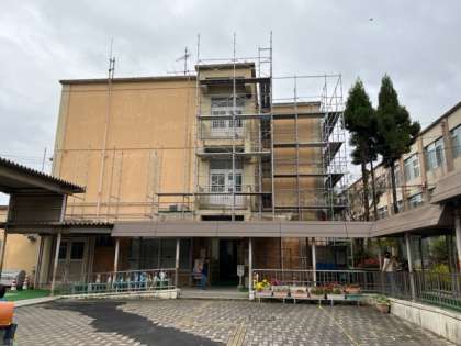 窓から足場がすぐそばに見えたり、一時的に窓のガードが外されたりしていますが、子どもたちはもちろん、現場で働く方々も安全に工事が進められますよう、双方十分に気を付けて連携を取り合いながら進めていただきます。