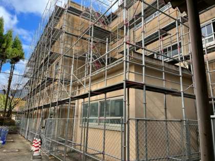 足場を組む工事が進み、あっという間に校舎は足場に覆われました。
