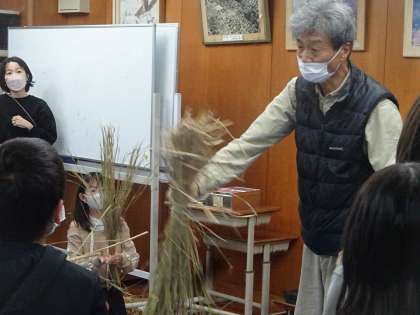 みんなで作ったお米の稲を利用してしめ飾りを作ります。