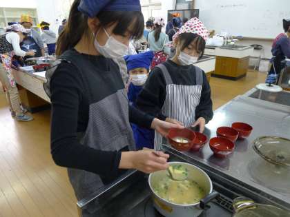 今日は1組で調理実習を行いました。自分達で育てた明徳米を使い、ご飯とお味噌汁を作りました。透明のガラス鍋なので、お米がどのように変化していくかをじっくり見ることができました。火加減に注意しながら調理し、おいしいご飯が炊きあがりました。煮干しで丁寧にだしを取り、家庭科室に良い香りがいっぱい漂いました。