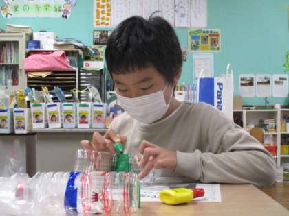 空のペットボトルを使って、サンタさんや雪だるま、ツリーなどクリスマスにちなんだ作品を制作しました。子ども達はマーカーやビーズ、カラフルなリボンでペットボトルをデコレーションしていきました。中に水を入れて、下からライトで照らすと可愛らしく光ると思います。