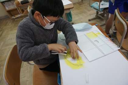 図画工作科の学習では、画用紙で型紙の版を作り、版画に挑戦しています。