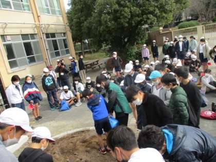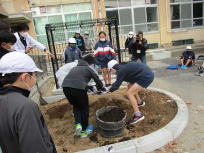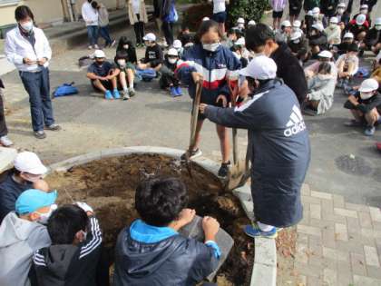これまで鉢で育ててきたアオギリですが,葉が落ちて冬眠のタイミングで植え替えました。広島からやってきた,大切な平和の木。明徳小学校で大きく育ってみんなを見守ってほしい!そんな思いで植え替えをしました。冬眠中でも根は伸びるそうで,水はしっかりやらないといけないです。よろしくお願いします。