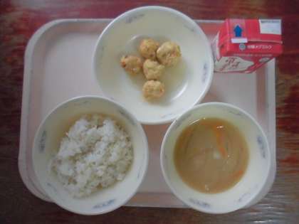 「がんもどき」は、鶏ひき肉・とうふ・おからパウダー・米粉を使い、手作りのおいしさを味わってもらえるよう、一から給食室で作りました。みじん切りにしたにんじんやしいたけ、えだ豆を入れ、一つずつだんご上にまるめて油で揚げました。がんもどきには、だしのきいたあんをかけて食べました。