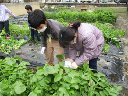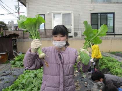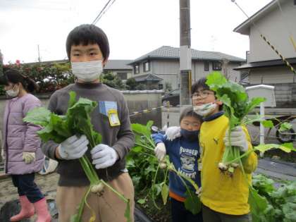 青々と茂った葉っぱを持ち上げると、スポッとカブが顔を出しました。10月上旬に撒いた種が、たった2か月でこぶし大のカブへと成長していて驚きです。