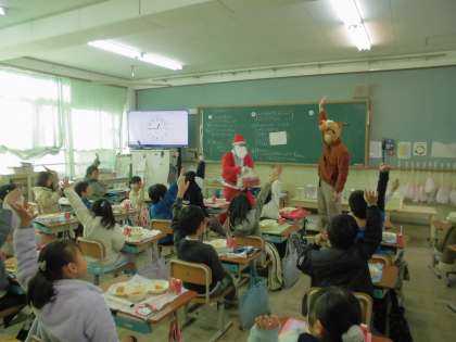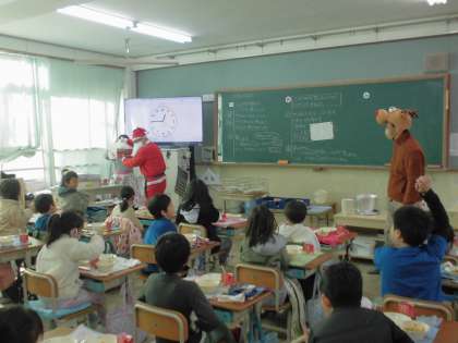給食時間に、サンタとトナカイがチョコレートケーキを