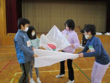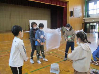 第1弾の今日は、ビニール袋やボールを使って仲良く遊びました。大きな袋に空気を入れて風船のように膨らませたり、ペアでボール運びをしたり、4人1組で風を使って袋を浮かせたり。様々な遊びを通して交流を深めました。
