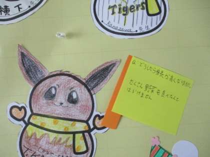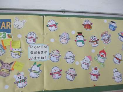冬バージョンは、先生たちがかいたさまざまな雪だるまたちです。雪だるまがもっている旗には何が書いてあるでしょう。そうです!タリー先生が書いたみんなからの質問へのお返事です。「日本語むずかしい・・・」と言いながら、がんばって書いてくださいました。みんなもじっくり読んでみましょう。そして、誰のかいた雪だるまかな?と思いながら見て、お気に入りをみつけてね。