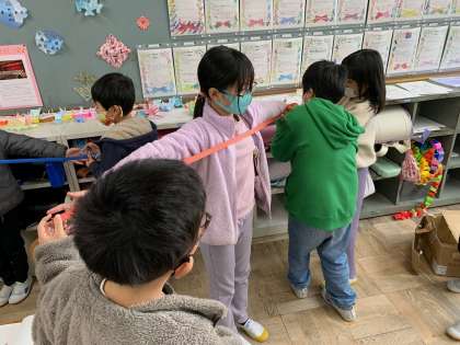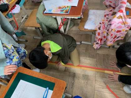 初めての100cmものさしの長さに驚きつつ、上手に測ることができました。