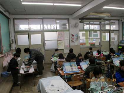 1年生の音楽では、カスタネット、すず、タンブリン、