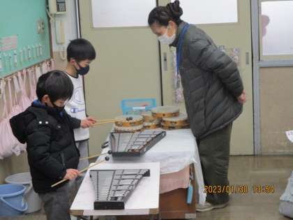 トライアングル、ウッドブロック、鉄琴などを使って演奏