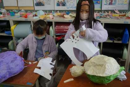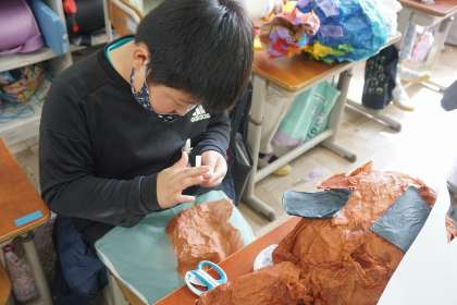 お花紙を丁寧に張り付けて、生き物たちの身体を覆ったり、材料を工夫しながら手足などのパーツをつけたりしています。