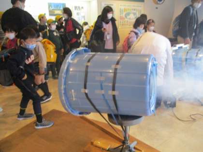 館内展示は日頃目にしない特別なものばかりで、子どもたちは興味津々でした。巨大な空気砲を撃ったり、ハンドルを回してオブジェを動かしたり、中にはたくさんのイモリを手に乗せ、大満足な子もいました。