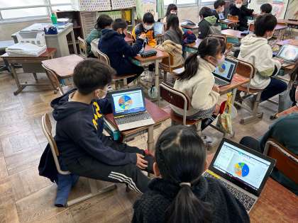 自分の聞きたいことをアンケートにまとめ、学級内で調査しました。その結果から、エクセルを使ってグラフを作り、調べた内容について発表会を行いました。