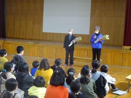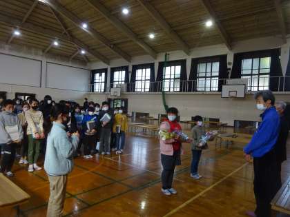 会の最後には、感謝の気持ちを込めてお米の収益で購入した花束を畑の先生にお渡ししました。