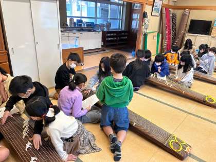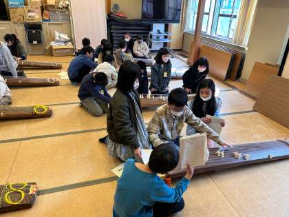 初めて触れるお琴に子どもたちは緊張しながらも、興味津々!