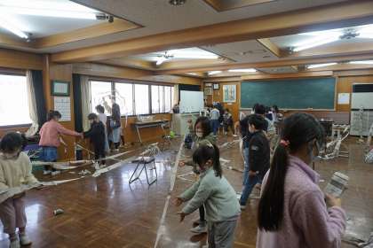 図画工作科「つないで つるして」の学習では、新聞紙や広告を細長く切り、テープでつないでどんな形ができるのかを見つけました。