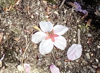 続いて桜の花のお話。桜の花びらは分かれて1枚ずつ散り、見事な桜吹雪となります。が、まれに花1輪ごと落ちているものもあります。メジロなどの鳥の仕業かと思っていたら、どうやらスズメのようです。メジロは長いくちばしで上手に蜜が吸えるのですが、スズメはくちばしが短くて難しい。そこで1輪ごと花の根元あたりで切り取り、強引に蜜を舐めてから捨てているらしいのです。スズメも一生懸命なのですね。