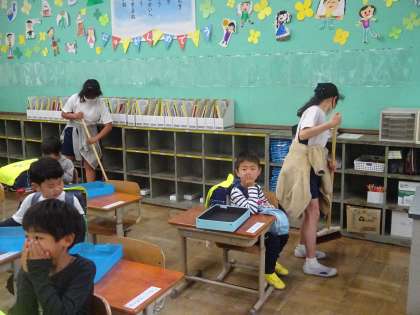 1年生の教室のお掃除。