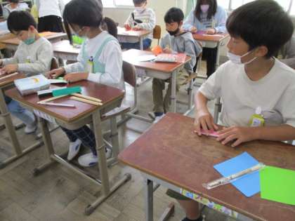 「1つの頂点から出ている2つの辺がつくる形を角という。」これは3年生で学習したことです。4年生では、辺を直線ととらえ、その直線がどれだけまわったかで角の大きさがきまることを学習します。角の大きさを考える教具として、割りばしと折り紙でおうぎをつくります。0の位置から半回転、1回転とさせ、角の大きさを認識します。このおうぎをつくるために、折り紙を8等分して蛇腹に折らなければなりません。これが結構手ごわい。8等分することが未経験の子がいっぱいですが、半分の半分で4等分に気付くと速いもの。あちこちで「わかった!」の声が上がります。折り紙は算数の力を高める基礎になっていますね。