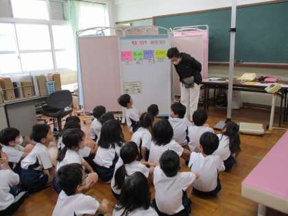 毎日を元気に過ごすには「食事」「睡眠」「運動」「笑顔」が大事だと養護の牧浦先生に教えてもらいました。