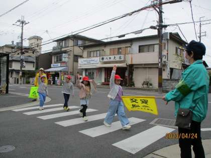 下鴨署から警察官さんと地域の見守り隊の方に、登下校の注意点を教えて頂き、安全に気を付けて校区を歩きました。