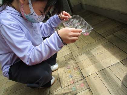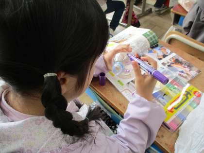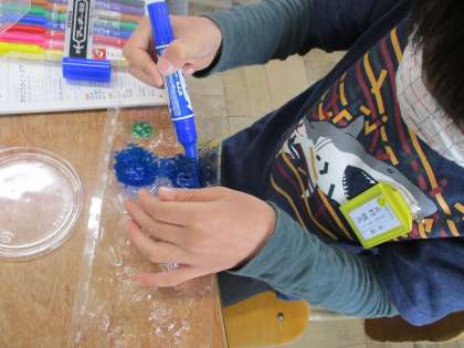図画工作科の「ひかりのプレゼント」では、透明の容器にカラーペンで色を付けました。