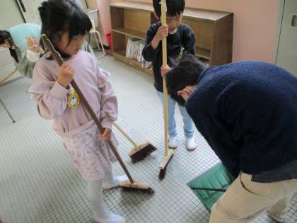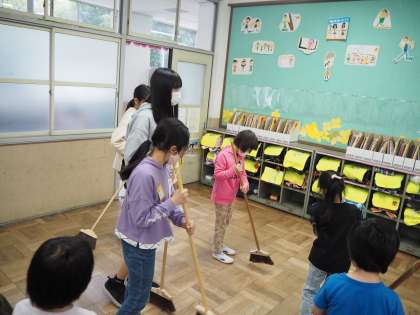 集団下校中は6年生が掃除をしてくれていましたが、今日から1年生も一緒に活動しました。ほうきの使い方や、机の運び方、廊下の掃除など、6年生に一つ一つ丁寧に教えてもらいました。