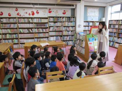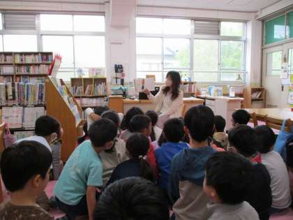 図書館で本を借りるのを楽しみにしていた2年生。図書館司書の先生に読み聞かせをしてもらったり、図書館の使い方のルールを確認したりしてから、それぞれ好きな本を借りました。