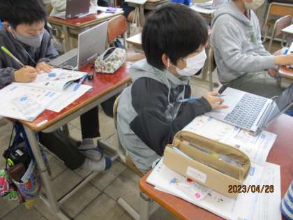 外国語科の学習では、教科書とデジタル教科書を両方使っています。教科書の巻末には「絵辞典」があり、習った単語を調べることができます。写真は自分が得意なスポーツを英語でどう書くか調べている様子です。デジタル教科書は、何度も聞いたり、音に合わせて言ったり、字幕を付けて見たりすることができる良さがあります。写真はLet's listen.の後半の問題を自分で聞いて解いている様子です。このように、用具は個別に自分に合った使い方もして、よりしっかり学んでほしいです。