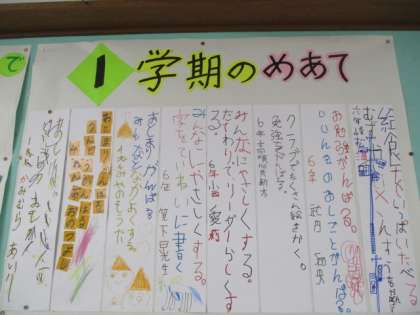 子どもたち一人ひとりが、1学期で頑張りたいことについて考え、「めあて」を書きました。